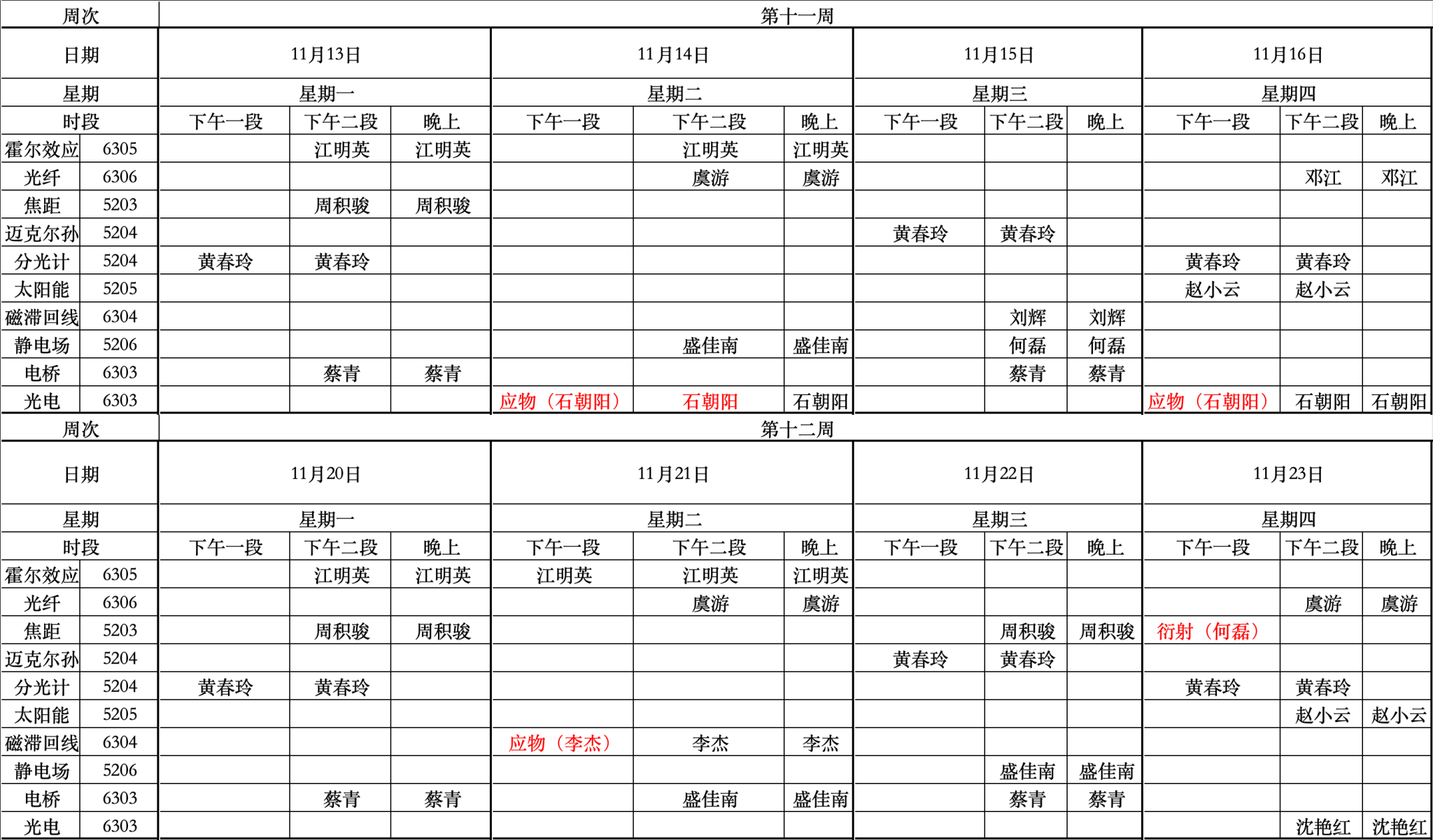 第十一周和第十二周物理实验课表