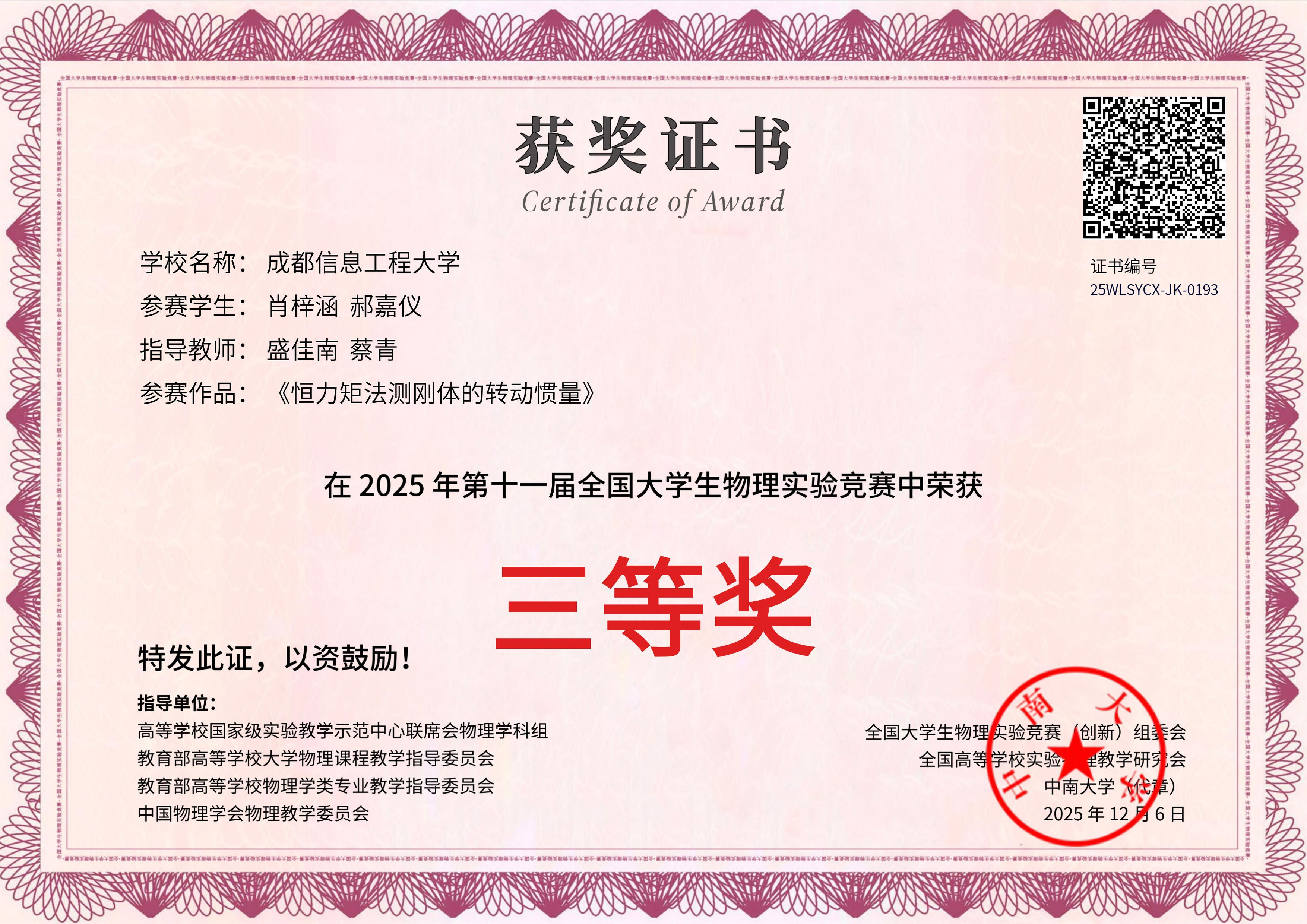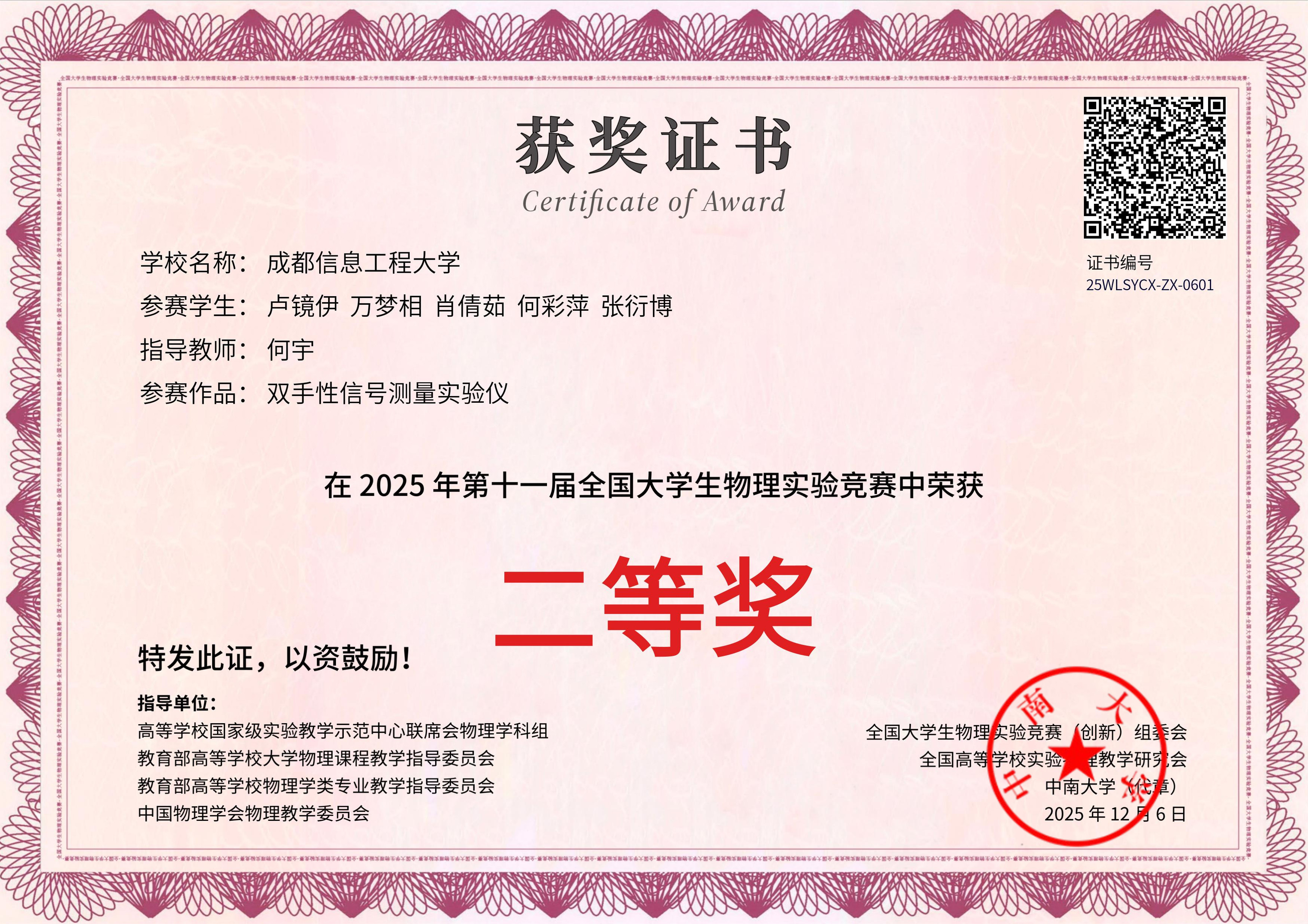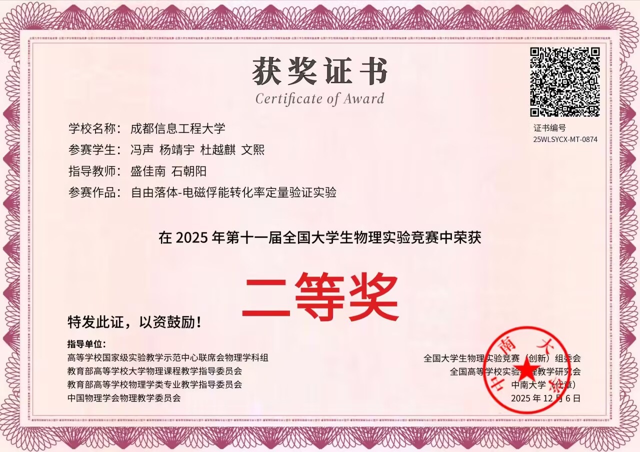 11月24日,第十一届全国大学生物理实验竞赛(创新)决赛在中南大学落下帷幕。我校学生在比赛中表现优异,共获得全国二等奖两项、三等奖两项,创下学校参加此项赛事的最好成绩。